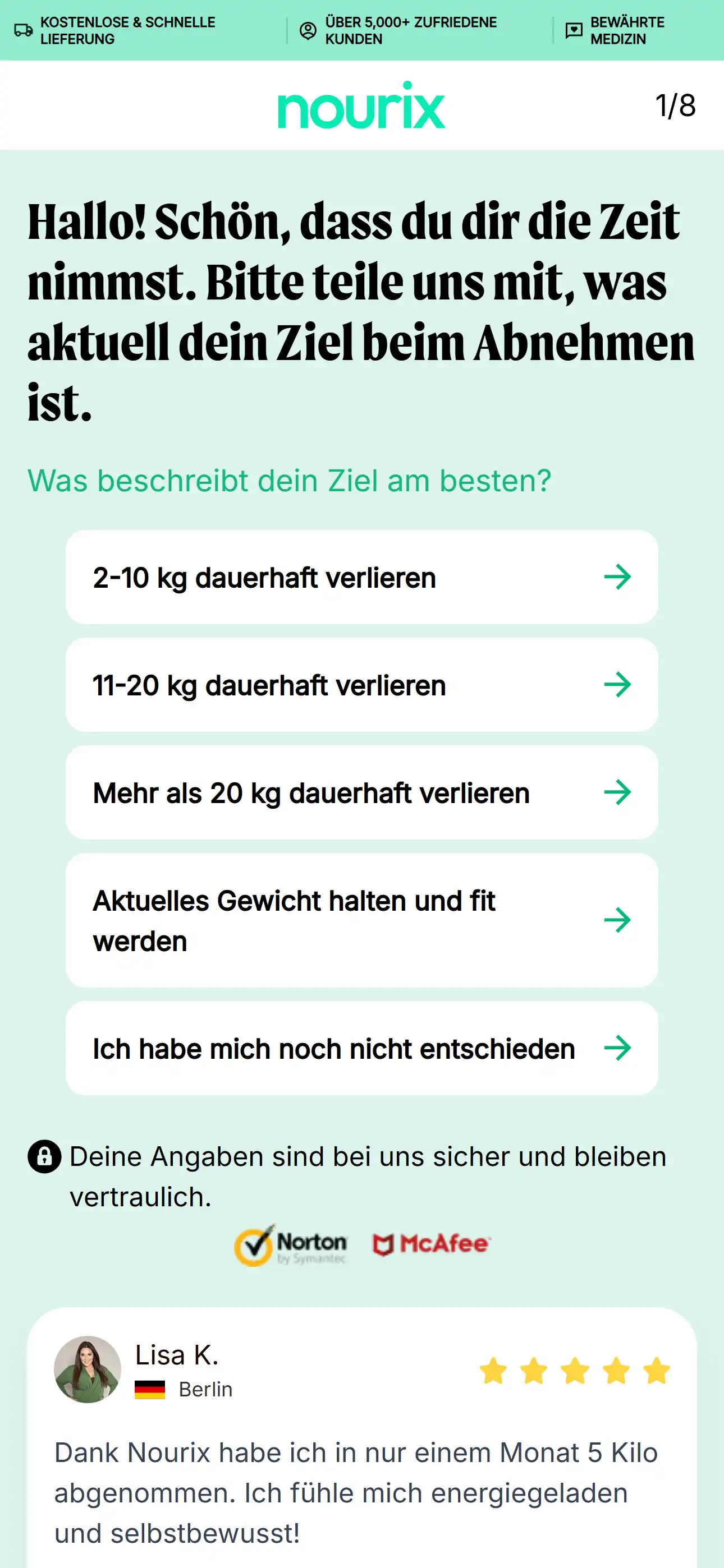 - Lisa K., Berlin: Dank Nourix habe ich in nur einem Monat 5 Kilo abgenommen. Ich fühle mich energiegeladen und selbstbewusst.